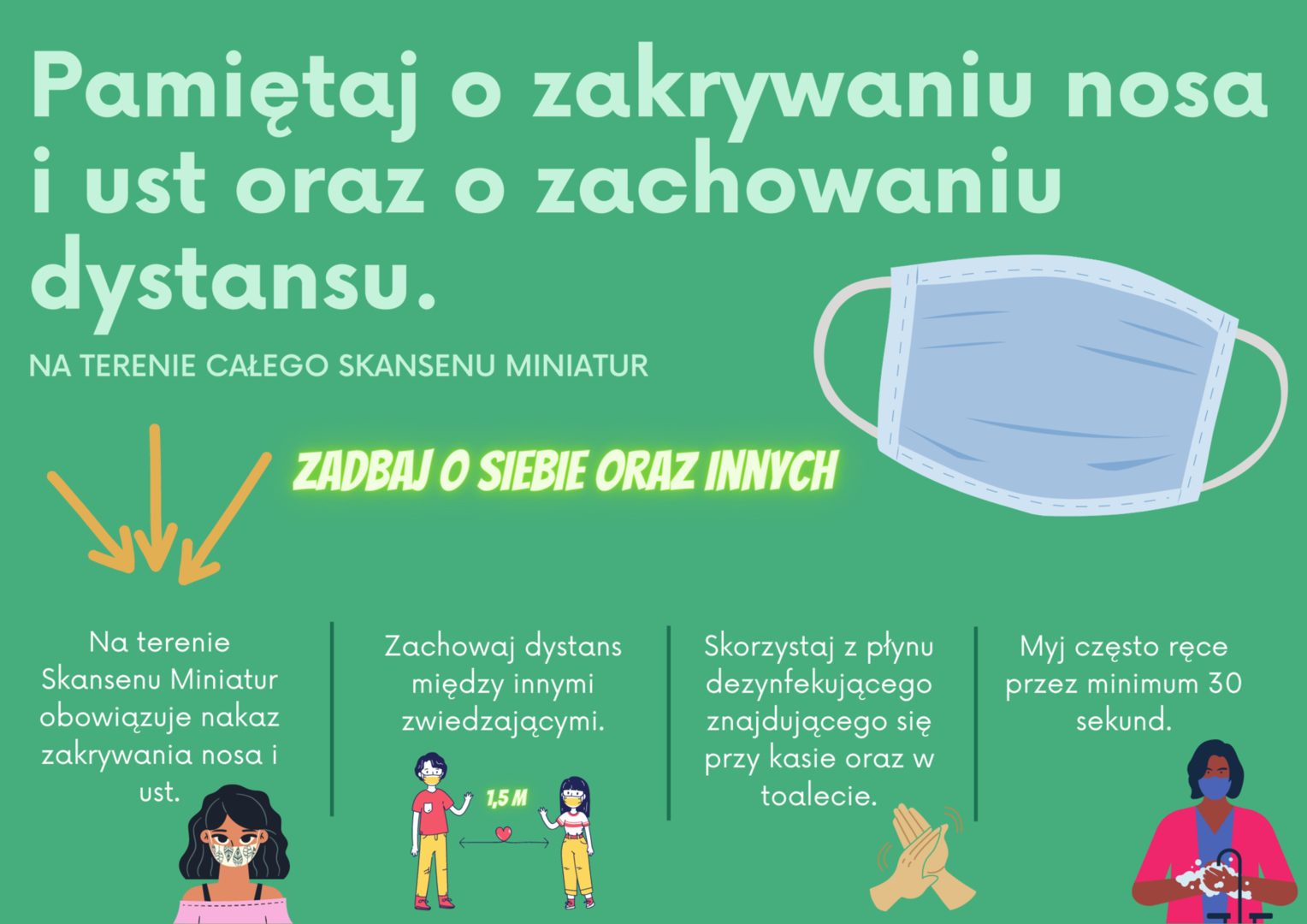 INFORMUJEMY RÓWNIEŻ, IŻ NA TERENIE SKANSENU STOSUJEMY SIĘ DO ZALECEŃ POZWALAJĄCYCH NA PRZEBYWANIE NA TERENIE SKANSENU 1os. na 15M2.