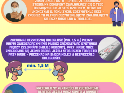 1. ZAKRYJ NOS I USTA - CHYBA, ŻE, POSIADASZ STOSOWNY DOKUMENT ZWALNIAJĄCY CIĘ Z TEGO OBOWIĄZKU LUB JESTEŚ DZIECKIEM, KTÓRE NIE UKOŃCZYŁO 5. ROKU ŻYCIA. ZDEZYNFEKUJ RĘCE - ZROBISZ TO PŁYNEM DEZYNFEKUJĄCYM ZNAJDUJĄCYM SIE PRZY KASIE LUB W TOALECIE.