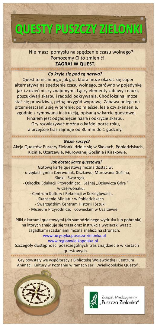 Puszcza Zielonka to nie tylko bardzo atrakcyjny Park Krajobrazowy, ale również edukacja, zabawa, rekreacja i turystyka. Idąc z duchem czasu Związek Międzygminny "Puszcza Zielonka" z tworzącymi go gminami, przy współpracy z Biblioteką Wojewódzką i Centrum Animacji Kultury w Poznaniu, stworzył 6 questów (w każdej gminie jeden), które przedstawiają jeden z najatrakcyjniejszych współczesnych sposobów zwiedzania. Wychodząc na przekur potrzebom turystów chcących brać czynny udział w poznawaniu nowych miejsc stwrzono adekwatne i interesujące do tego narzędzie.
